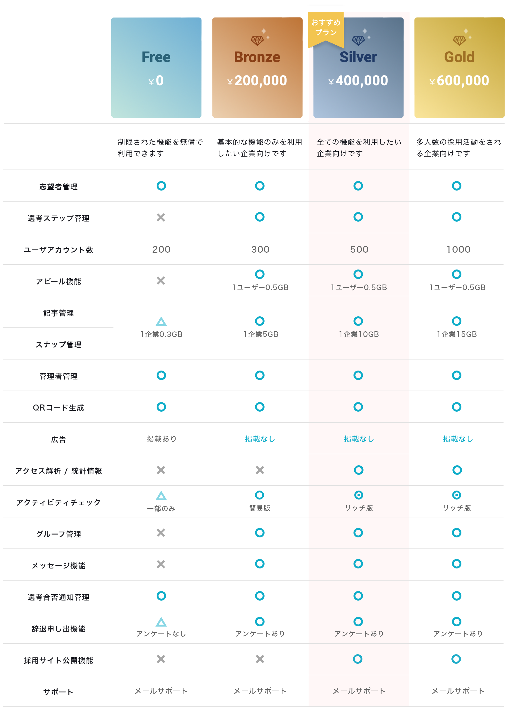 採用規模とゴールに合わせたプランをご用意しています。 Freeプランに登録してからプラン変更もできます。